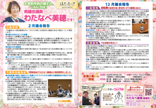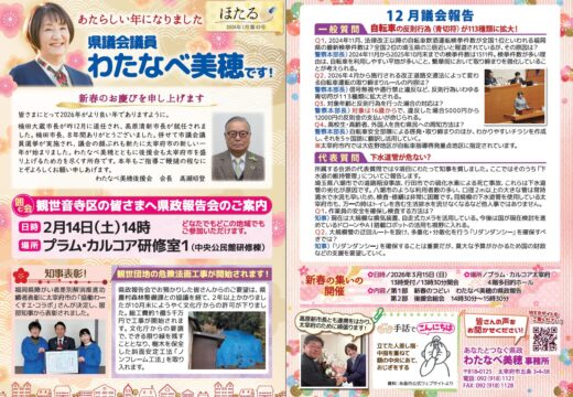 年四回発行の広報誌「ほたる」を通じて、福岡県議会議員わたなべ美穂の活動のご報告をさせていただきます。